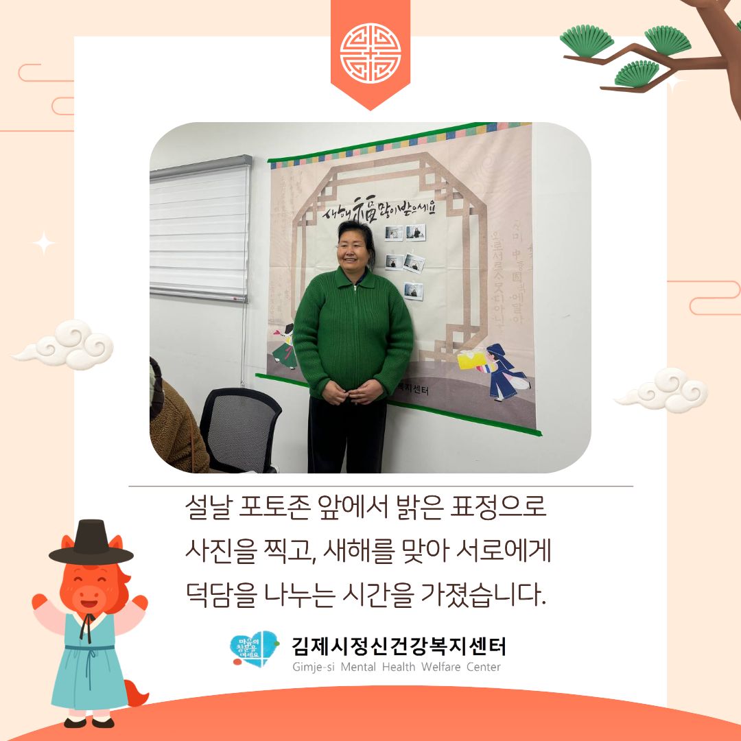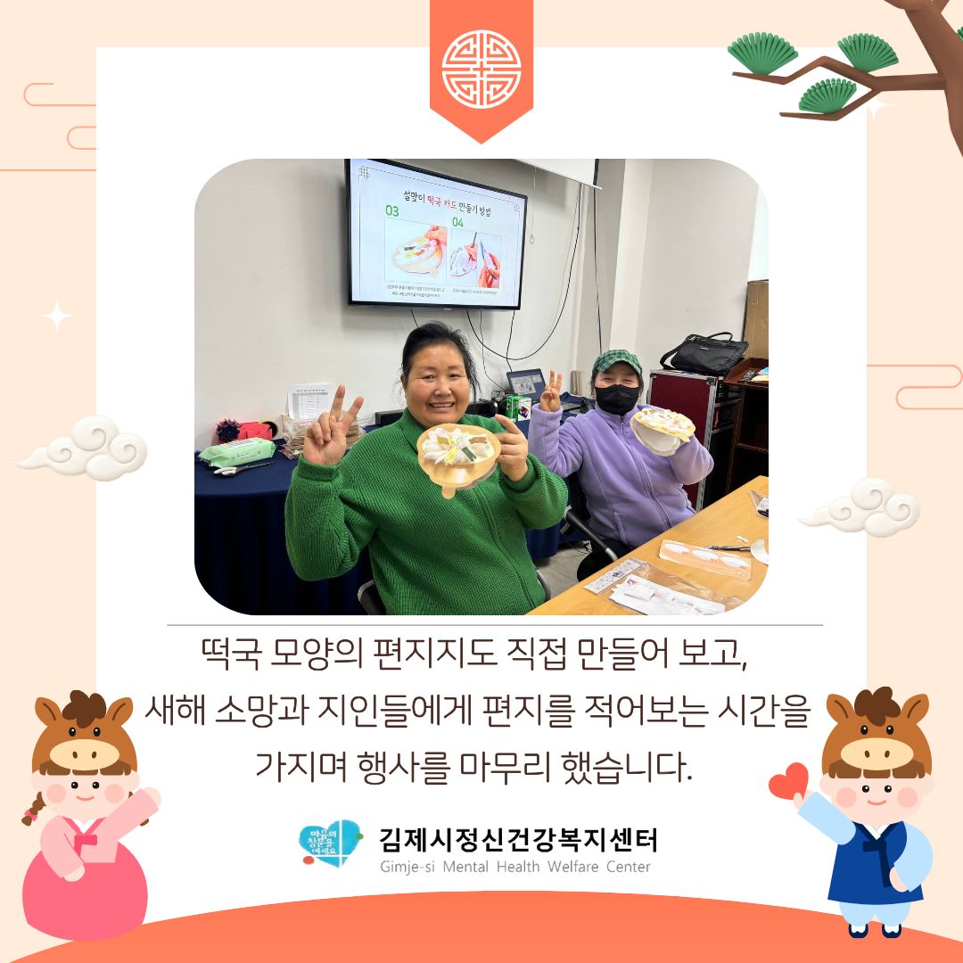2026년 병오년 새해를 맞이하여 김제시정신건강복지센터는 중증 등록회원님들과 함께 설맞이 명절행사 프로그램 "2026년 마(馬)음을 나누는 설날"을 진행하였습니다. 새해를 맞이하여 서로 덕담을 주고 받는 시간을 가지고, 미니 약과와 떡국 카드 만들기 체험 활동을 통해 성취감을 느낄 수 있었습니다. 2026년도 김제시정신건강복지센터는 더욱 의미있는 한 해가 되도록 노력하겠습니다! 문의 : 김제시정신건강복지센터 정신건강사업팀 (063-542-1350) #김제시정신건강복지센터 #전라북도 #김제시 #정신건강복지센터 #정신건강 #설날 #명절프로그램 #중증정신질환관리사업 ![]() ![]() ![]() ![]() ![]() ![]() |